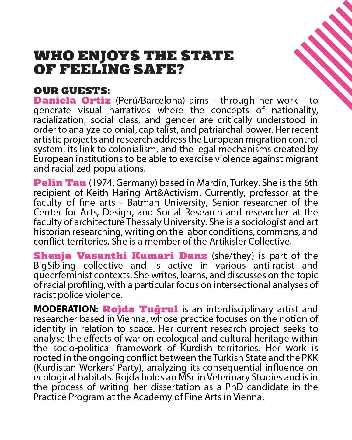 Es handelt sich um eine dreitägige Veranstaltung mit Podiumsdiskussion (Who enjoys the state of feeling safe? online), Lesung (über Sexarbeit - online) und Workshop (Take your space - Schreibwerkstatt für BIPOC und migrantische Menschen - in Wien) zu relevanten Themen.